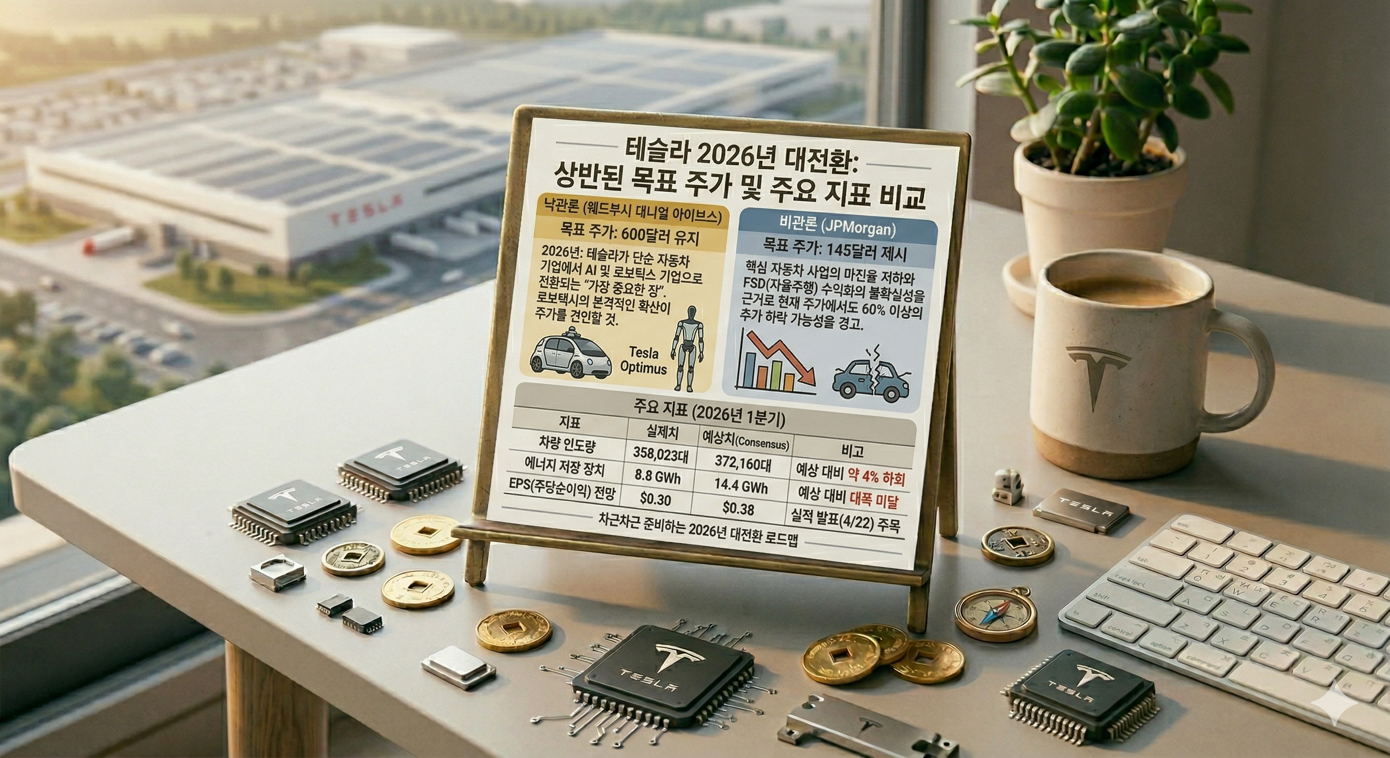 주요 지표 (2026년 1분기) 실제치 예상치(Consensus) 비고 차량 인도량 358,023대 372,160대 예상 대비 약 4% 하회 에너지 저장 장치 8.8 GWh 14.4 GWh 예상 대비 대폭 미달 EPS(주당순이익) 전망 $0.30 $0.38 실적 발표(4/22) 주목