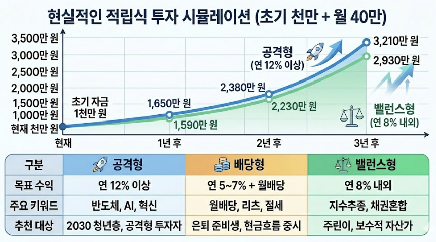 3년 투자 시 예상 수익 비교 구분 공격형 배당형 밸런스형 목표 수익 연 12% 이상 기대 연 5~7% + 월배당 연 8% 내외 안정적 주요 키워드 반도체, AI, 혁신 월배당, 리츠, 절세 지수추종, 채권혼합 추천 대상 2030 청년층, 공격형 투자자 은퇴 준비생, 현금흐름 중시 주린이, 보수적 자산가