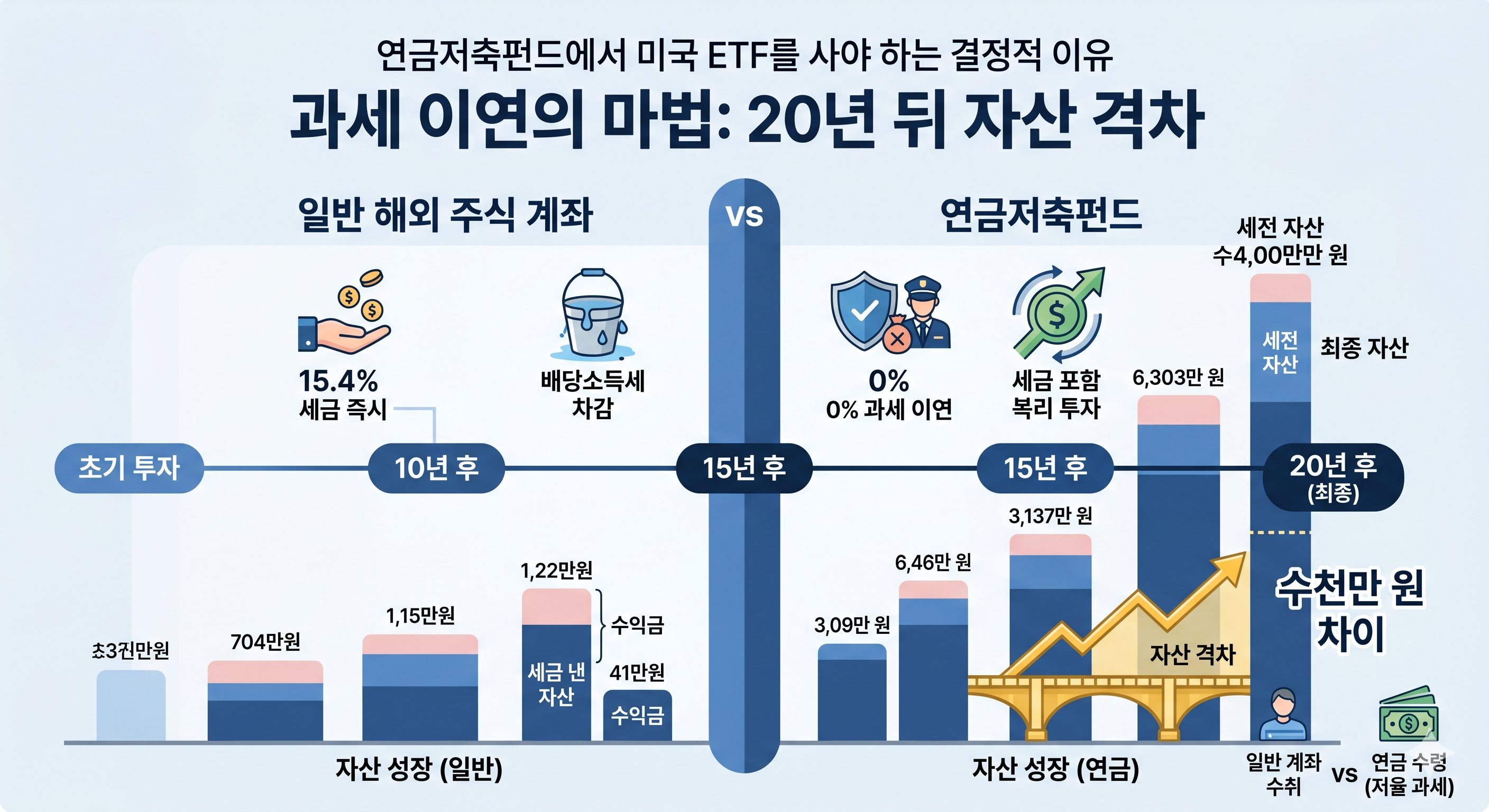 일반 주식 계좌 vs 연금 저축 계좌 절세 효과 왜 일반 계좌가 아닌 연금계좌에서 미국 ETF를 사야 할까요? 바로 **'과세 이연'**의 마법 때문입니다.