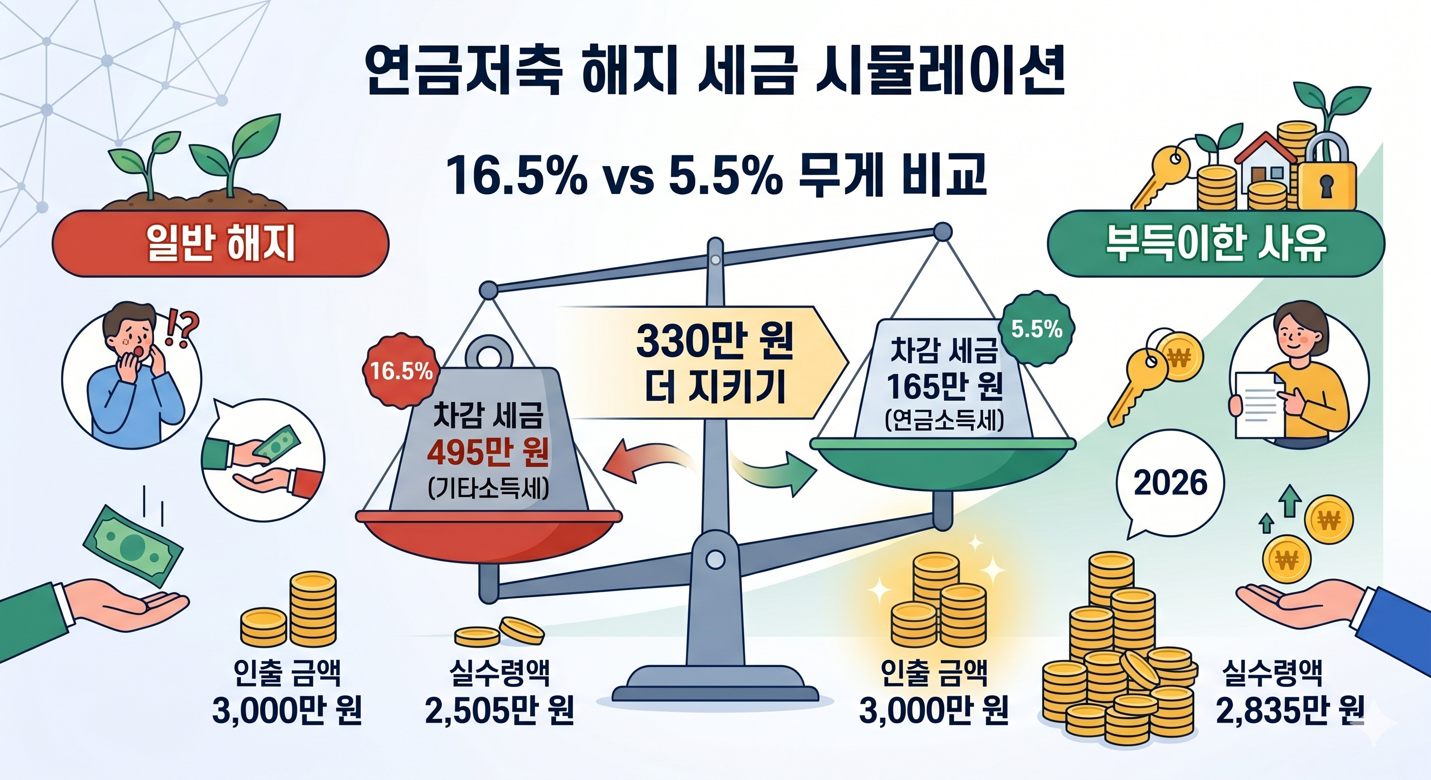 구분 일반 해지 (기타소득세 16.5%) 부득이한 사유 (연금소득세 5.5%) 인출 금액 3,000만 원 3,000만 원 차감 세금 495만 원 165만 원 실수령액 2,505만 원 2,835만 원 - 결과: 사유 증빙 하나만으로 330만 원의 소중한 내 자산을 더 지킬 수 있습니다.
