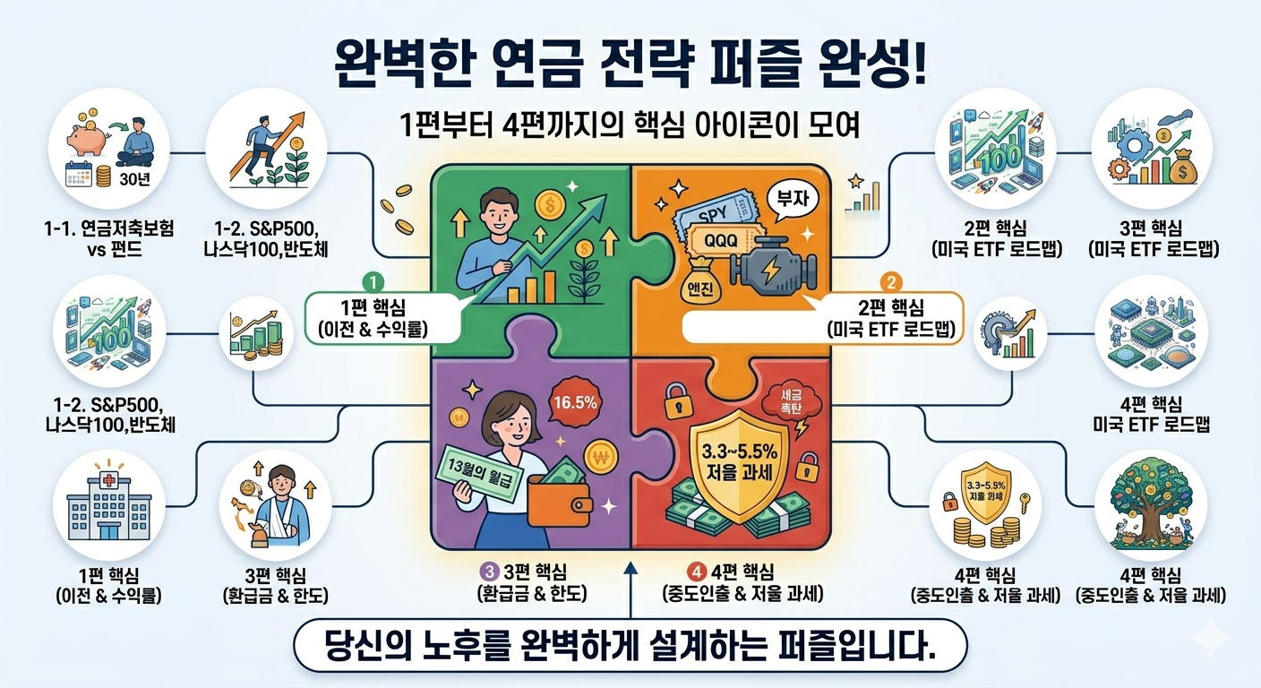 개인 연금 시리즈 정리 4편에 걸친 연금 시리즈를 통해 우리는 보험 탈출부터 ETF 운용, 세액공제 극대화, 그리고 위기 관리법까지 모두 마스터했습니다. 연금은 가입하는 것보다 **'끝까지 유지하는 것'**이 훨씬 어렵고 중요합니다. 급한 상황이 오더라도 오늘 배운 저율 과세 활용법과 담보대출 전략으로 여러분의 소중한 노후 자금을 끝까지 지켜내시길 바랍니다.