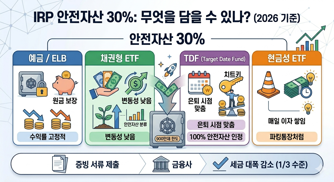 IRP 안전 자산 30% 무엇을 살 수 있나? 안전자산이라고 해서 무조건 은행 예금만 있는 것은 아닙니다. 2026년 기준 IRP에서 선택 가능한 **안전자산 30%**의 종류는 다음과 같습니다.