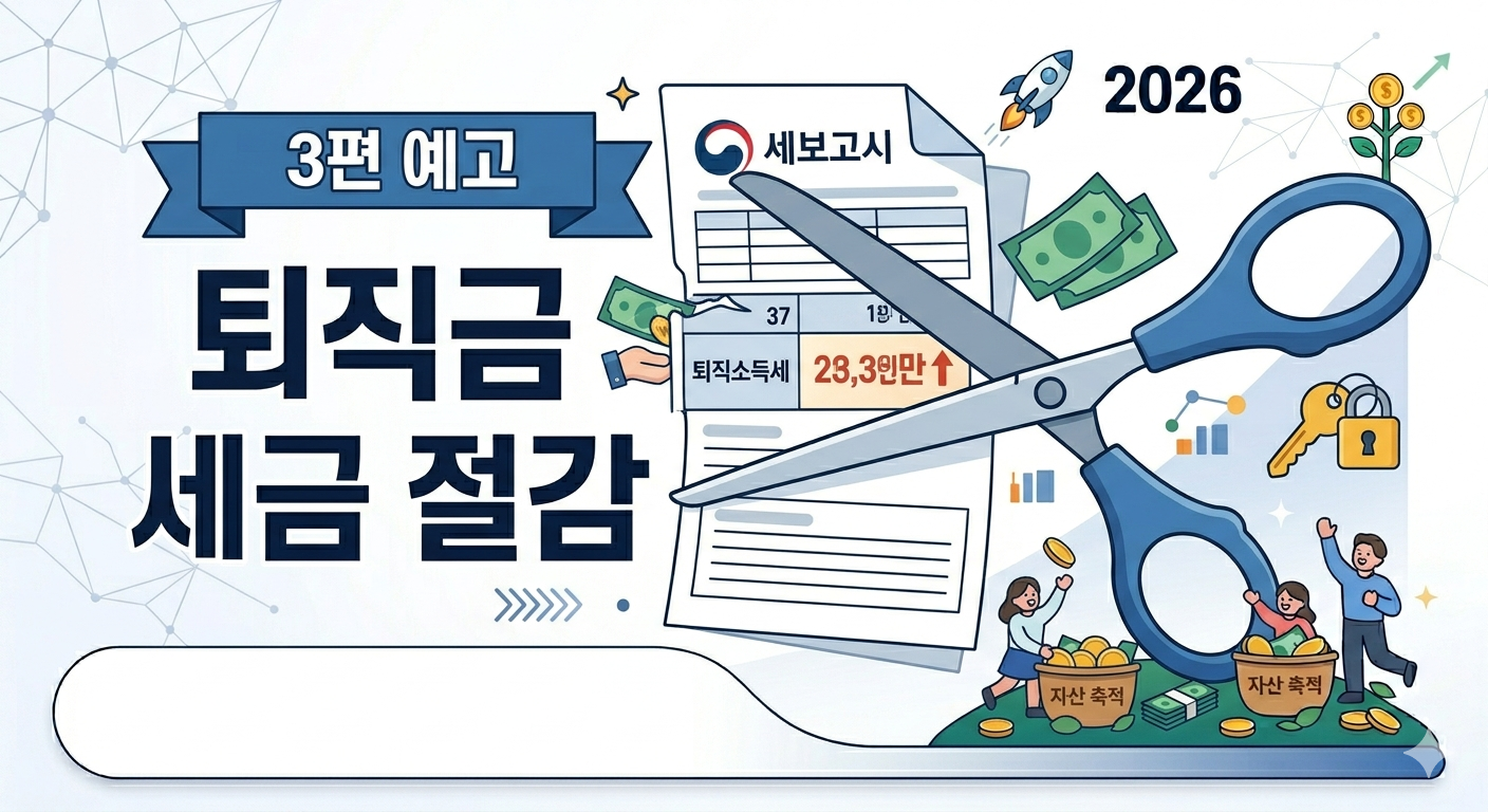 [절세 #1] 세금만 아껴도 수익률 15% 상승? ISA·연금저축·IRP 절세 계좌 완벽 비교 (0) 2026.04.23 [IRP #3] 퇴직금 바로 찾으면 손해! IRP 계좌 수령으로 퇴직소득세 아끼고 노후 자금 지키는 법 (0) 2026.04.23 [IRP #1] 2026 IRP 가입조건 및 세액공제 한도 총정리: 직장인·사업자 필독 가이드 (0) 2026.04.22 [연금 #4] 급전이 필요할 때 필독! 연금저축 중도인출 페널티 없이 저율 과세 받는 법 (0) 2026.04.21 [연금 #3] 연말정산 환급금 99만 원의 마법: 연금저축 600만 원 한도 완벽 활용법 (0) 2026.04.21