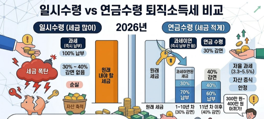 메타 디스크립션 평생 모은 퇴직금, 일시금으로 바로 받으실 건가요? IRP 계좌 수령을 통해 퇴직소득세를 최대 40%까지 감면받는 비결을 공개합니다. 2026년 기준 퇴직소득세 계산 원리와 세금을 아끼는 현명한 연금 수령 전략을 확인하세요.